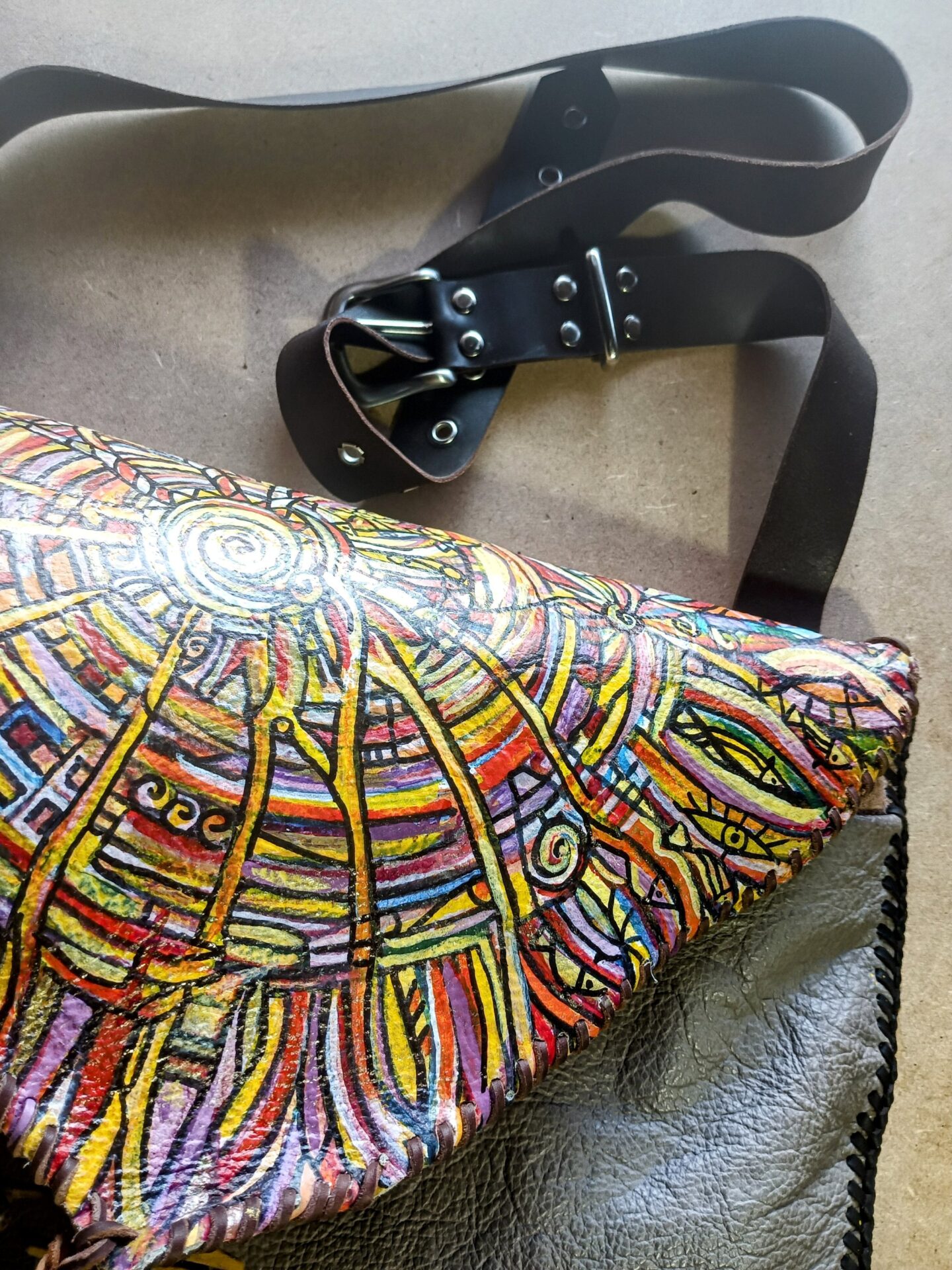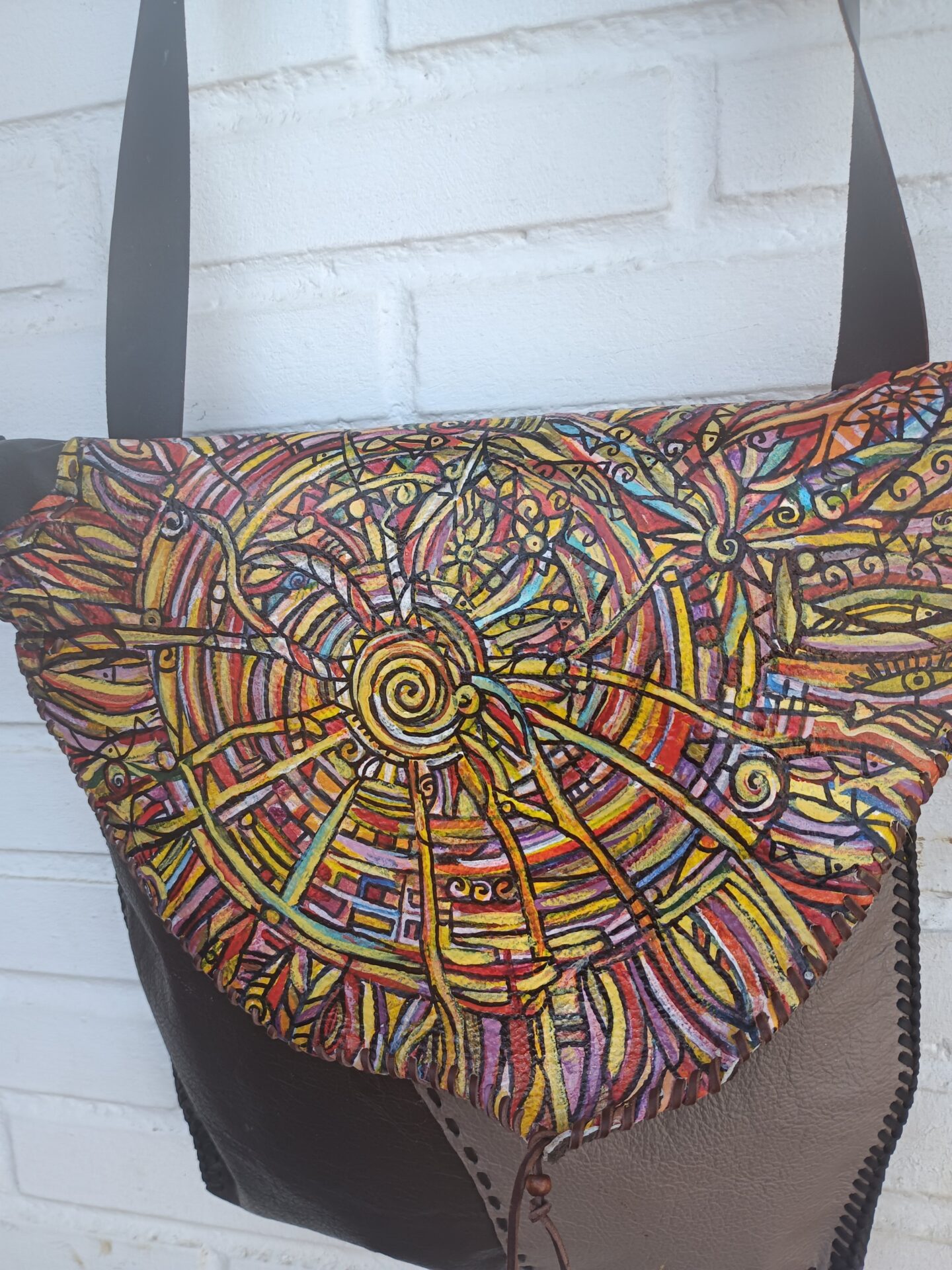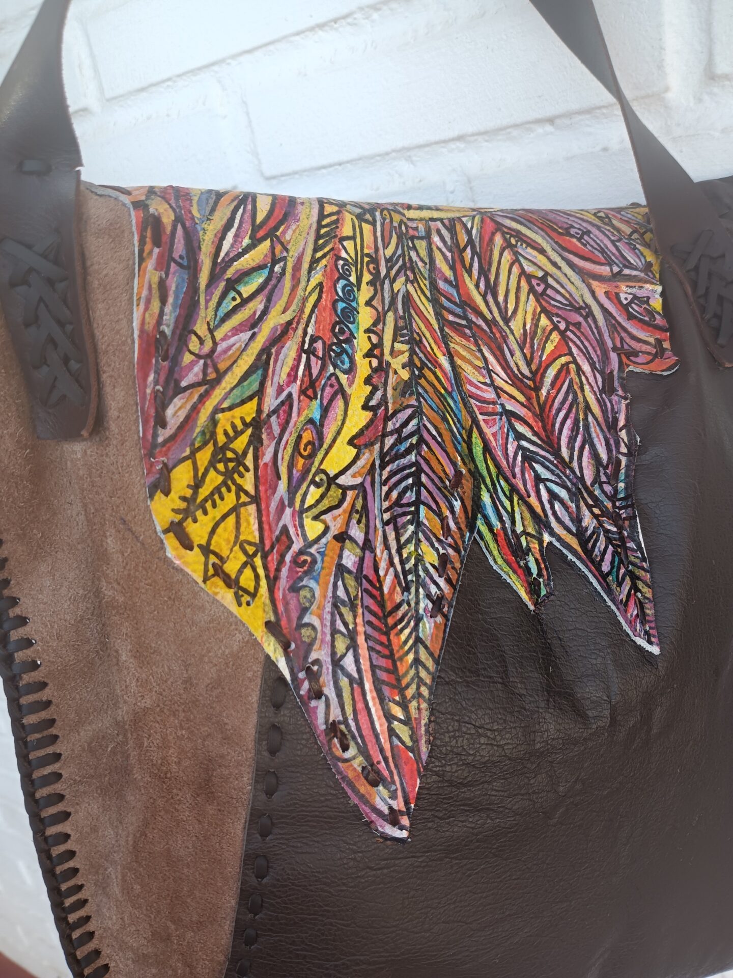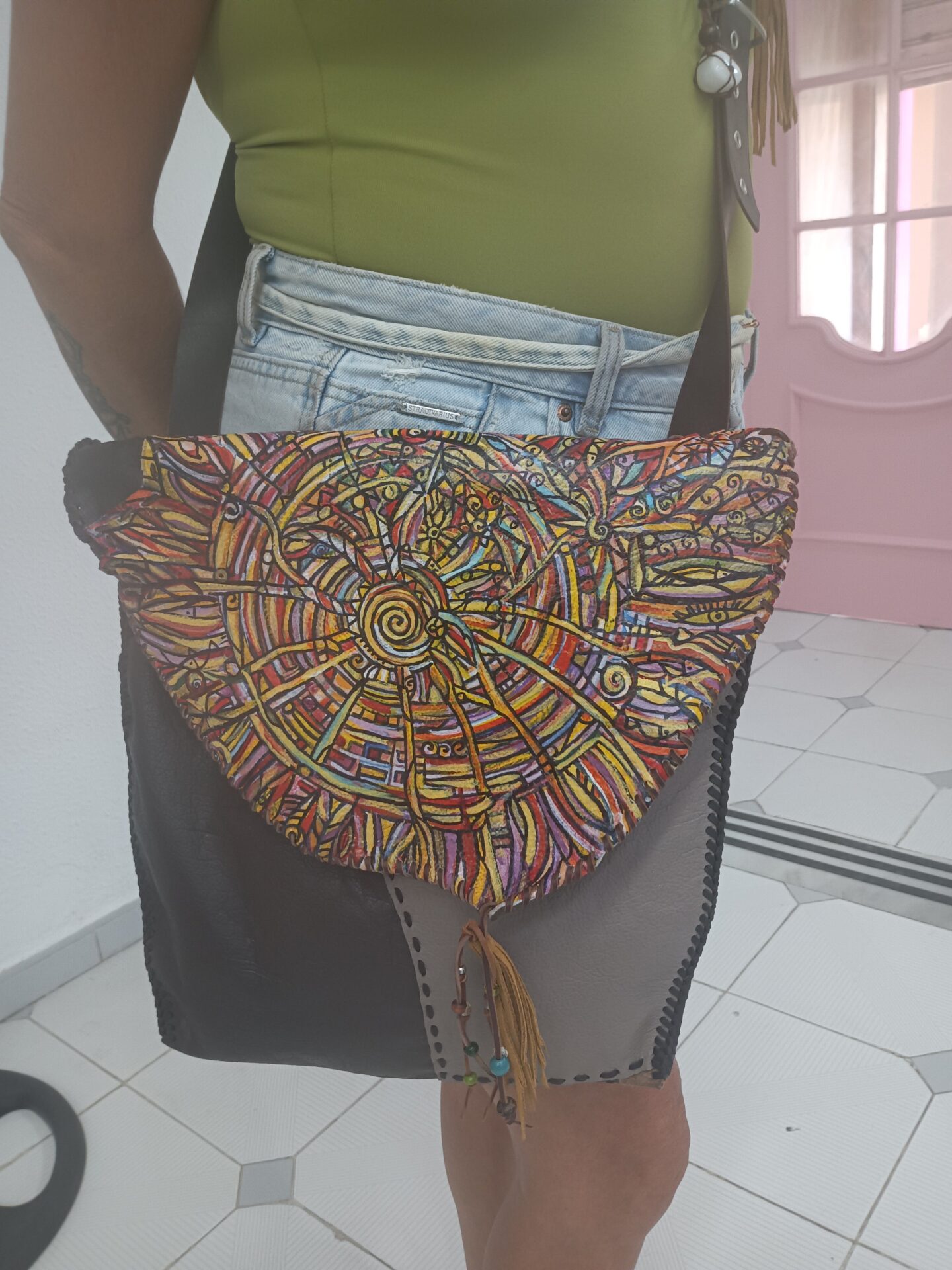 original pieza , cosida a mano con tireta de cuero usando en los bordes costura de punto español, cierre de cremallera y solapa pintada a nuestro estilo abstracto Troka, con asa larga de becerro y cierre de hebilla , el resultado , un bonito práctico y único bolso que llamara la atención allí donde vayas. Este artículo es íntegramente hecho a mano y por encargo. Las dimensiones son de 30×40 cm. las dimensiones pueden variar si así lo desea el cliente.
