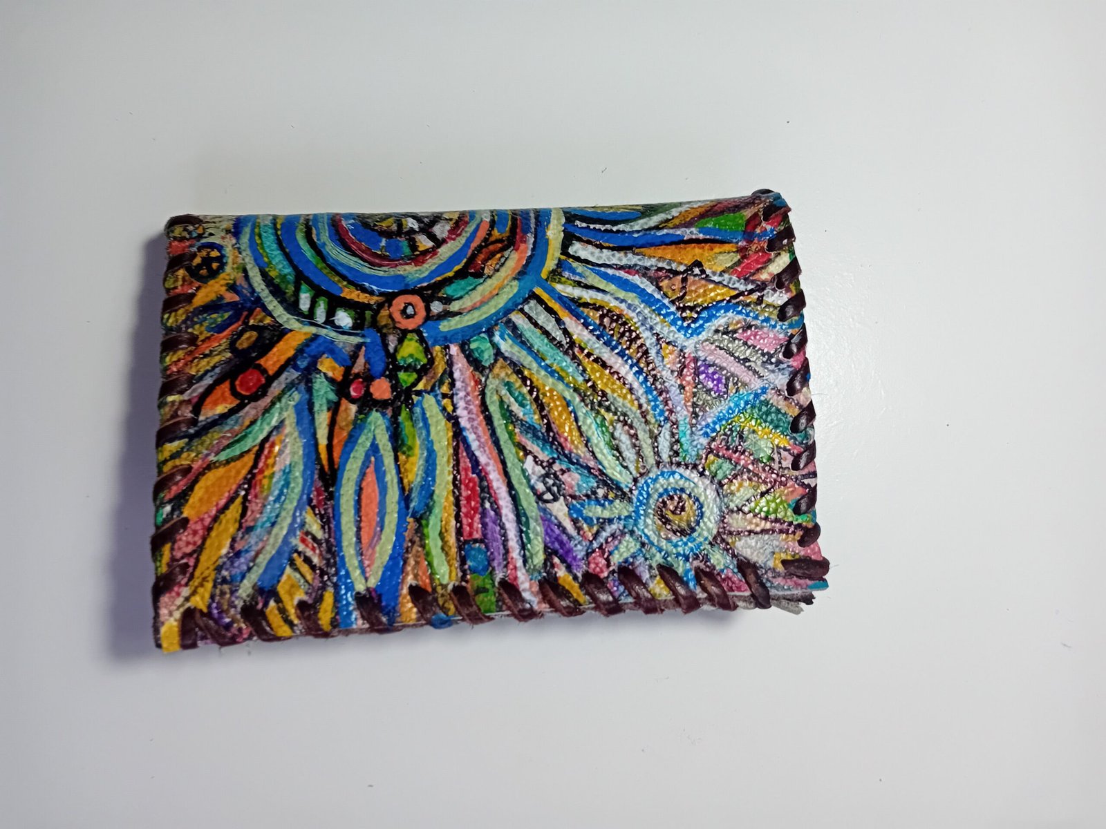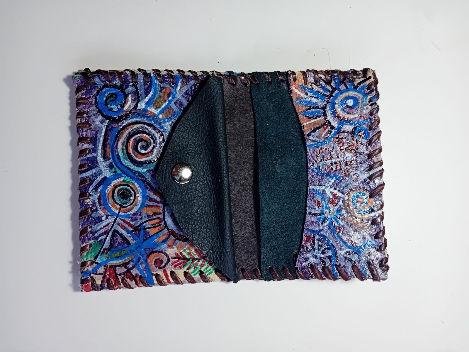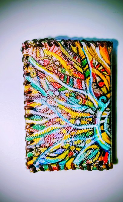 Está Cartera pintada y cosida a mano es pieza única , con pintura en su portada y en el interior con bolsillo para las monedas y para las tarjetas y billetes. No hay otra igual.