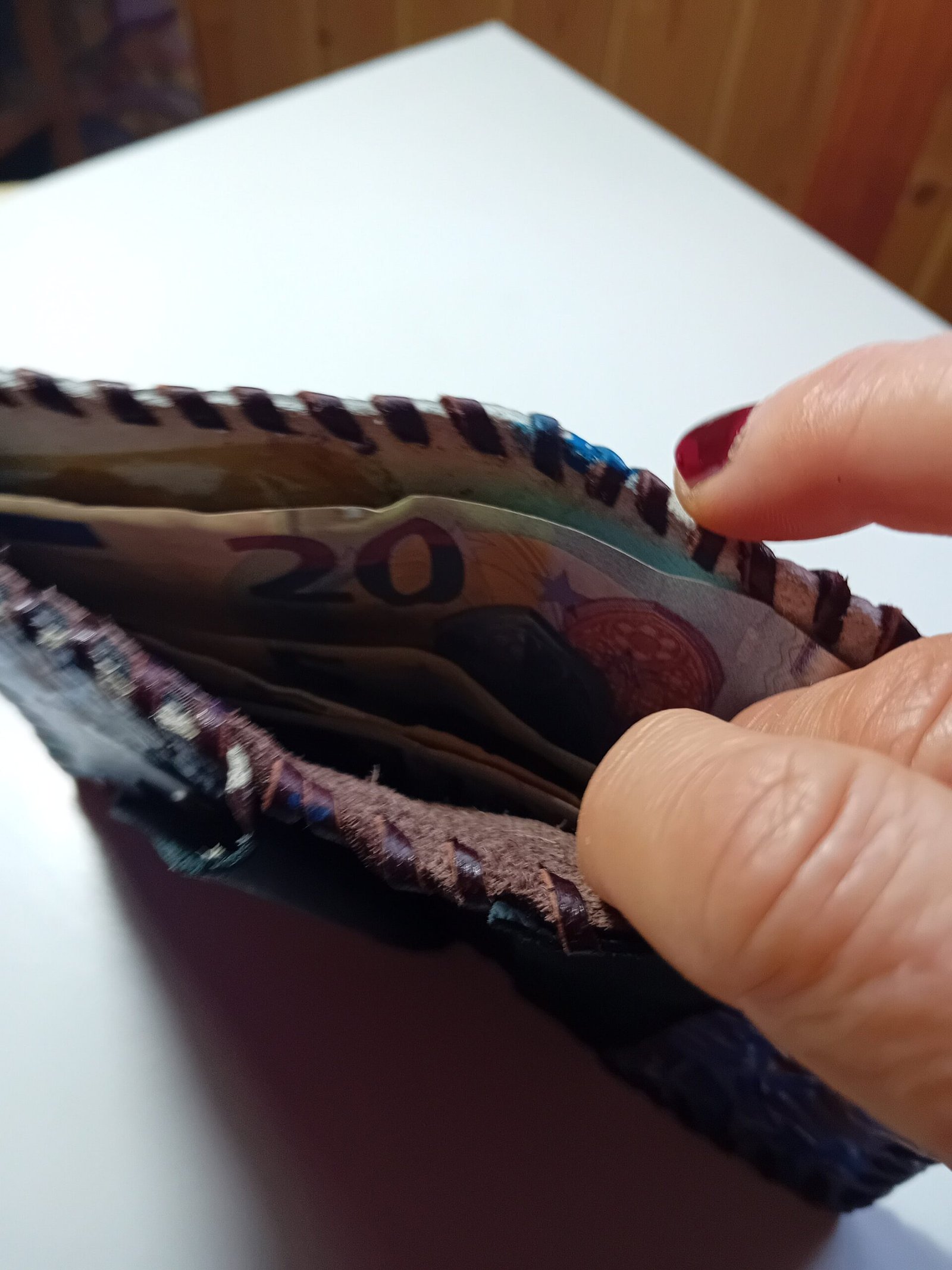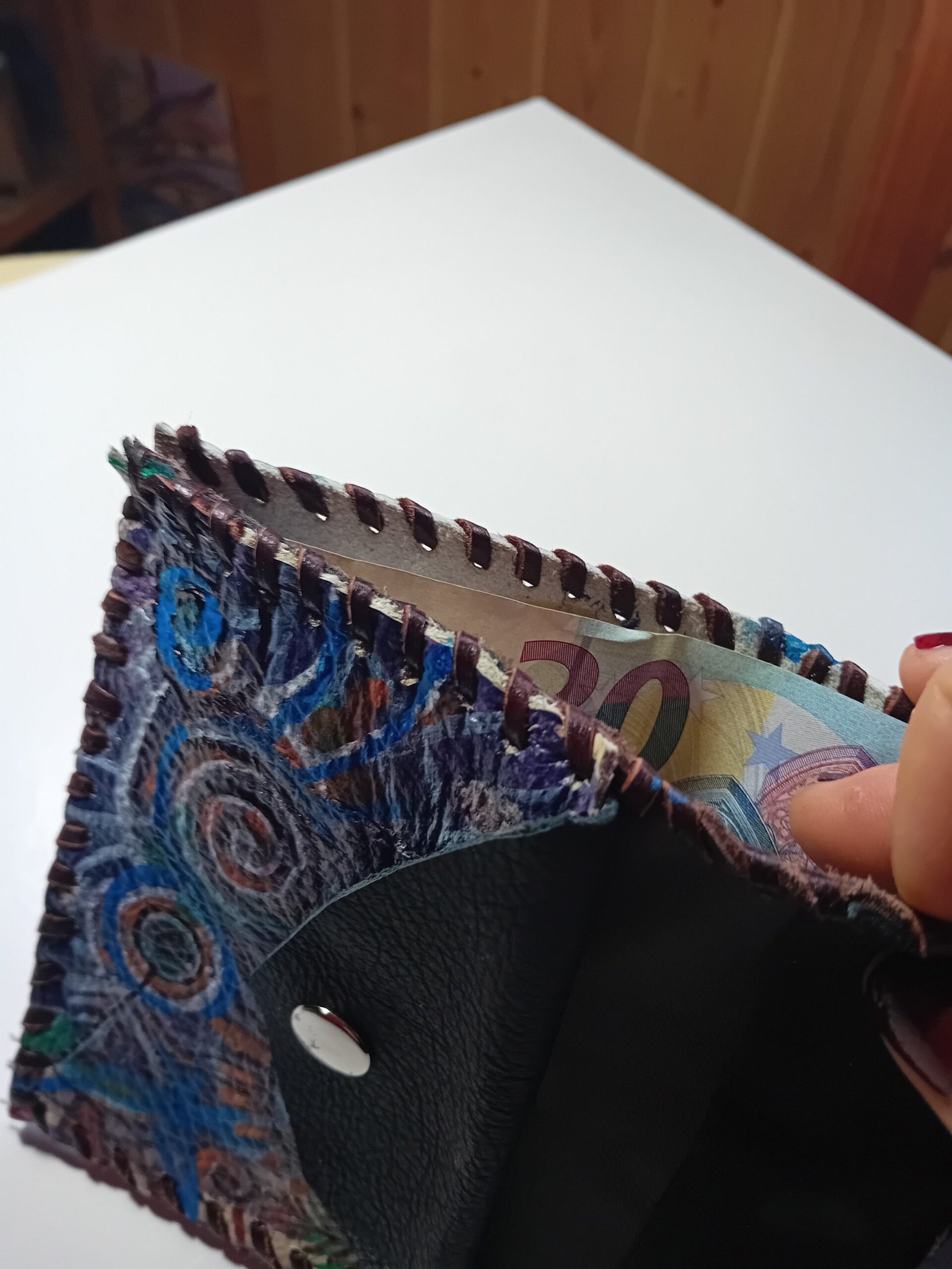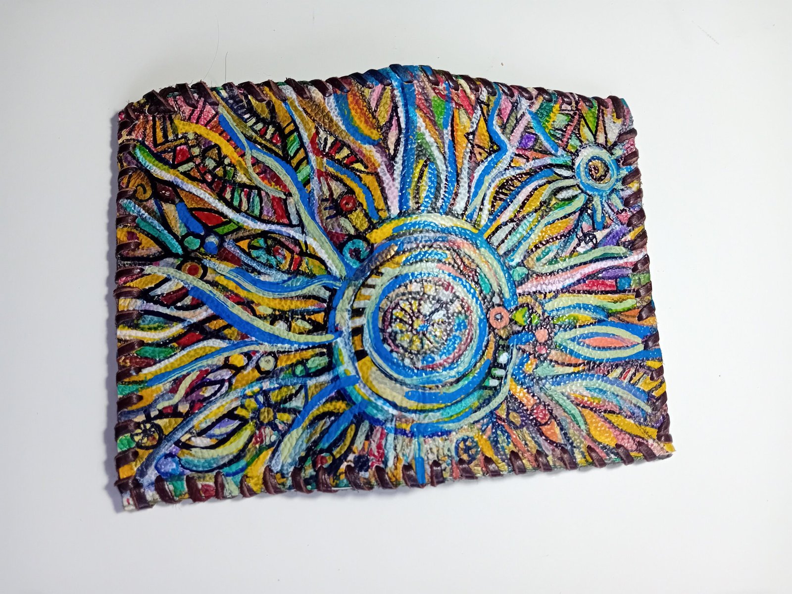 Está Cartera pintada y cosida a mano es pieza única , con pintura en su portada y en el interior con bolsillo para las monedas y para las tarjetas y billetes. No hay otra igual.
