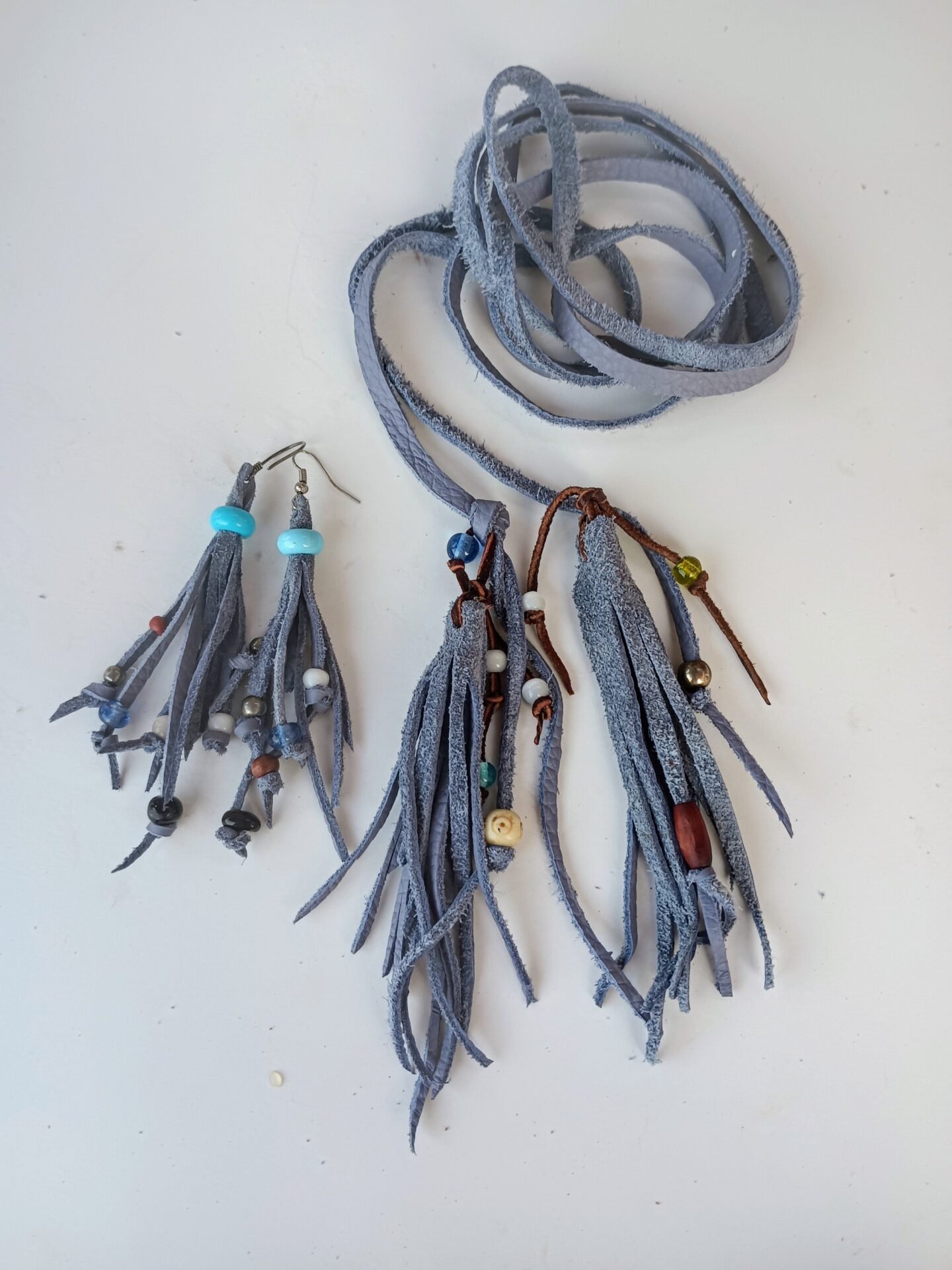 Tira de cuero de ante azul claro, con pendientes a juego ,, la tira sirve de cinturón o de collar que da varias vueltas al cuello , pues mide un metro, es un conjunto , original , práctico y muy bonito