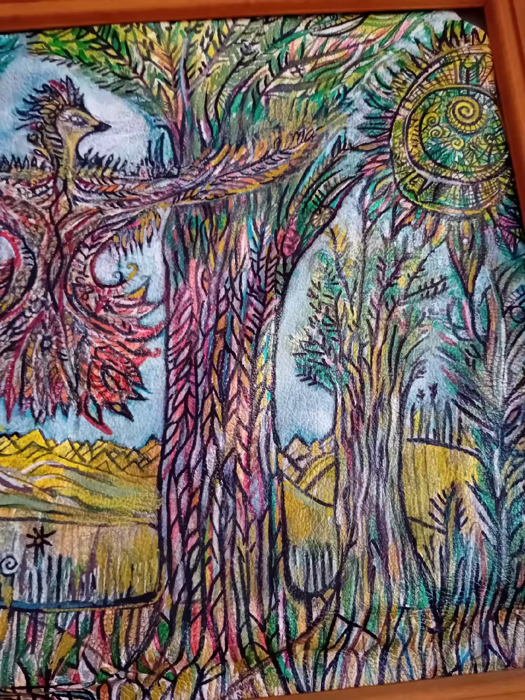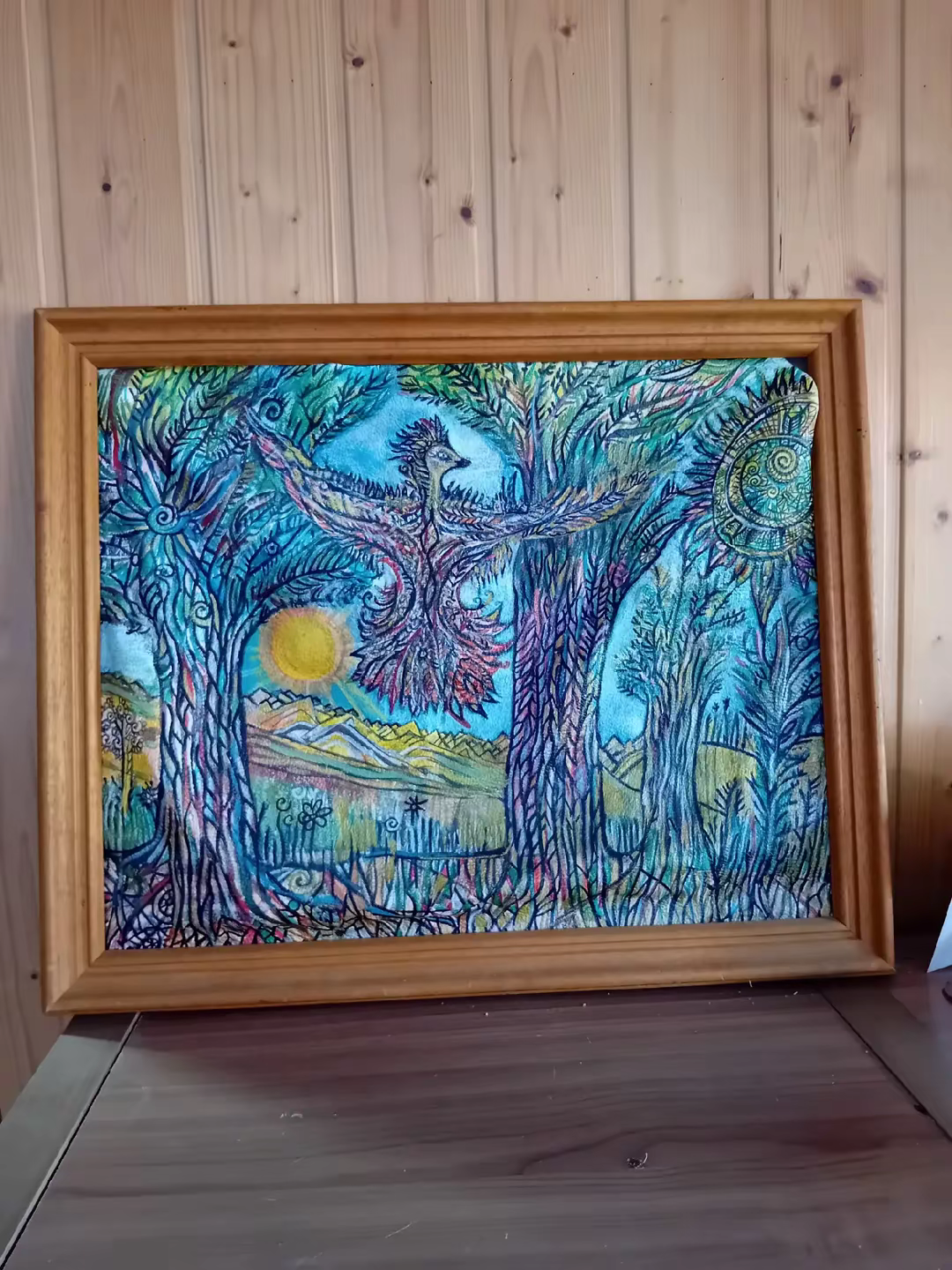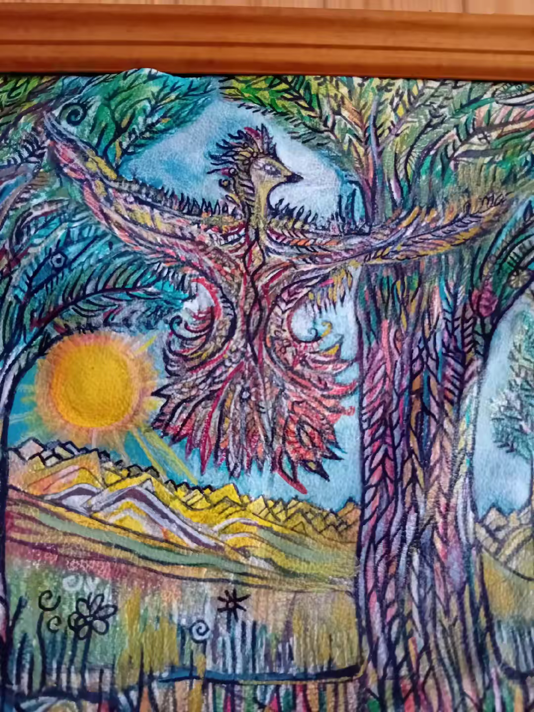 original pintura sobre retal de cuero reciclado , que representa la importancia de las gallinas en nuestras vidas, ponedoras de ricos huevos y el resurgir y renacer del ave fenix🔥🪶🪽, mide 70 por 50 cms y está pintada con pincel y tintes especiales para la piel.
