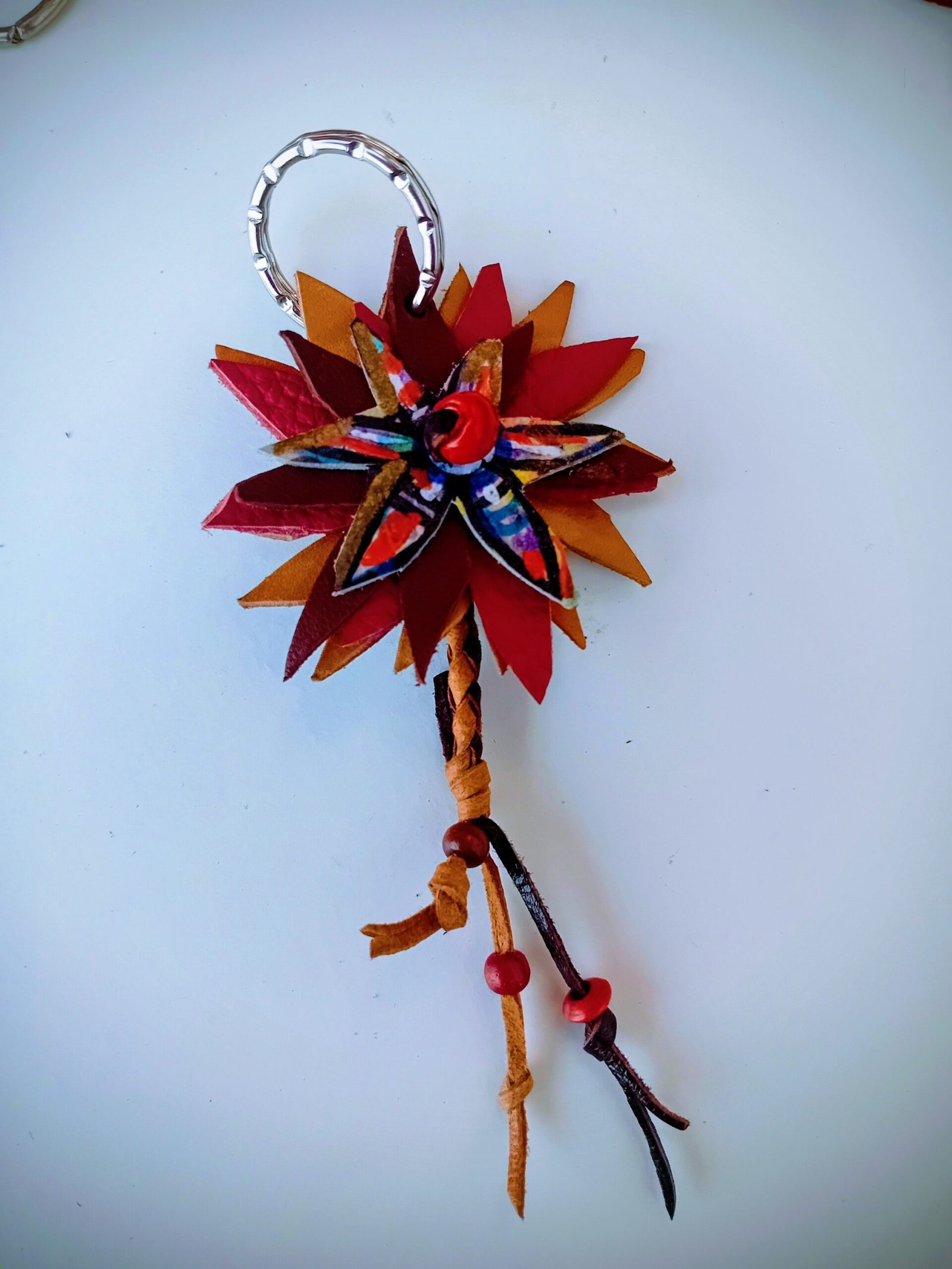 Este llavero flor del Sur es de tonos rojos predominantes , combinando dos tipos de cuero para el acabado con trenza y abalorios, con este llavero nunca se pierden las llaves.