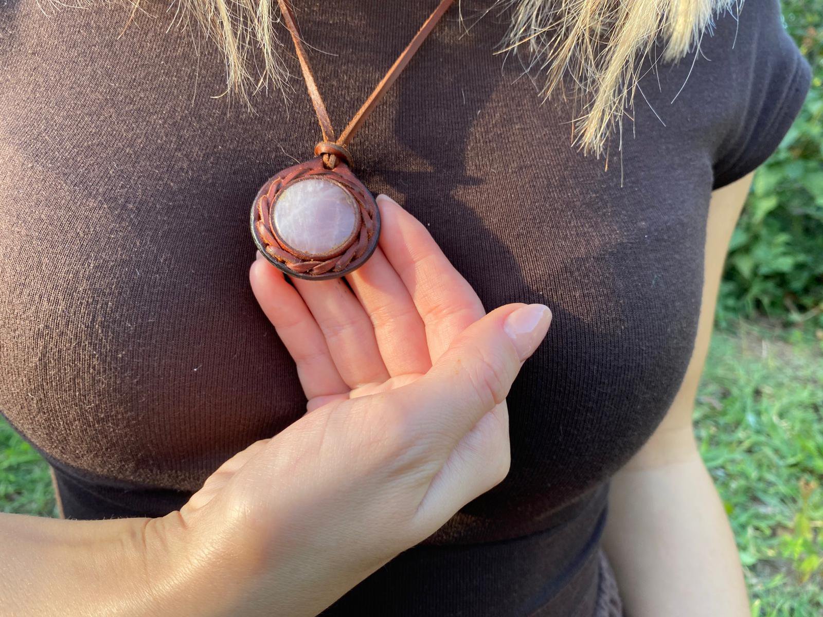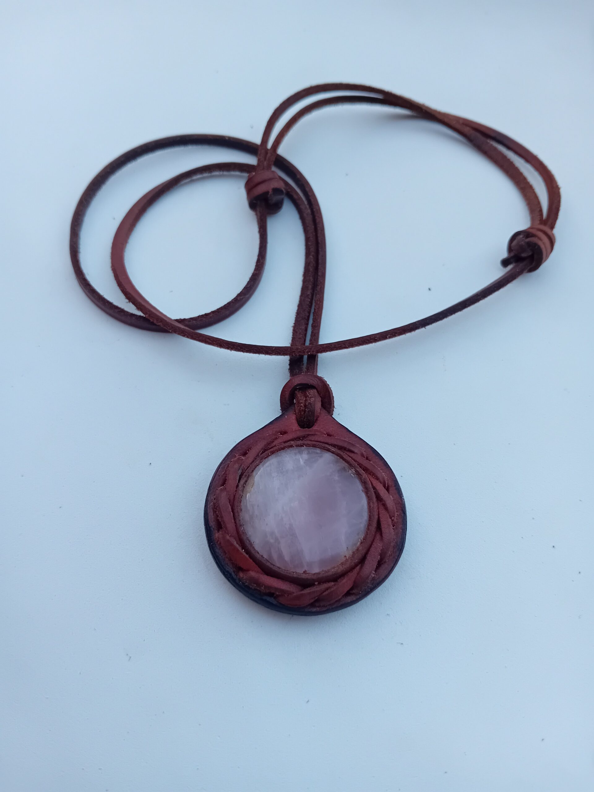 Bonito collar de cuero vegetal con piedra semipreciosa cuarzo rosa.